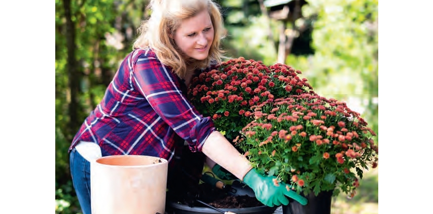 Odmiany gruntowe chryzantem są niezwykle efektownym, chociaż wciąż mało docenianym elementem kompozycji ogrodowych. Idealne miejsce dla nich to niższe grupy rabat bylinowych, gdzie mogą być doskonałym uzupełnieniem innych bylin kwitnących o tej samej porze np. astrów. Posadzone w towarzystwie traw będą tworzyć dynamiczną i przykuwającą wzrok kompozycję. Rośliny sadzone do gruntu muszą mieć odpowiednie warunki – najlepiej lubią miejsca słoneczne i chronione od wiatrów. Pamiętajmy jednak, że do gruntu sadzimy chryzantemy najpóźniej pod koniec lata – na przełomie sierpnia i września – by zdążyły dobrze ukorzenić się przed zimą. Kupionych w pojemnikach późną jesienią nie można sadzić na stałe na ogrodowe stanowisko, bo na pewno się nie przyjmą. Chryzantemy w pojemnikach są świetną ozdobą tarasów, balkonów oraz stref wejścia. W tej formie możemy cieszyć się nimi około 2 miesiące. Do towarzystwa dodajemy im wrzosy i wrzośce, owocujące psianki oraz papryczki. Dla podkreślenia nastroju obok pojemników możemy ułożyć ozdobne dynie, jabłka, kasztany, a nawet przebarwione liście czy gałązki traw. Doniczki z chryzantemami można także trzymać w domu, sprawdzają się również doskonale jako kwiat cięty i to nie tylko do dekoracji nagrobków. Są ozdobą bukietów układanych z gałązkami jesiennych liści i astrami.