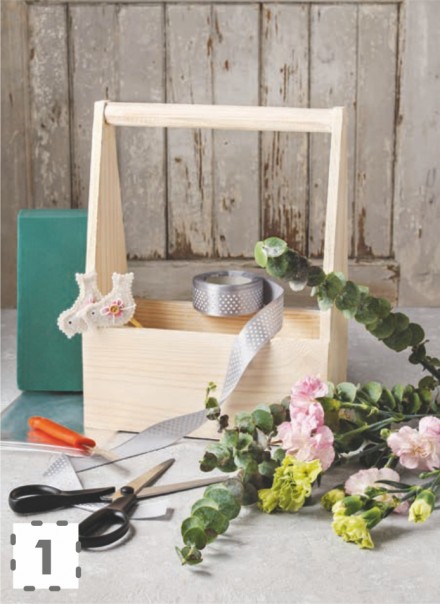 Do wykonania kwiatowej ikebany potrzebne będą: drewniana skrzynka narzędziowa (ale może być też inna niewielka skrzynka np. na drobne owoce), gąbka florystyczna (mokra), szeroka dekoracyjna wstążka, arkusz folii pakowej (celofan), świeże kwiaty polecane do ikeban (długotrwałe np. goździki), ozdobny motyw okazjonalny na patyczku, ostry nożyk, nożyczki.