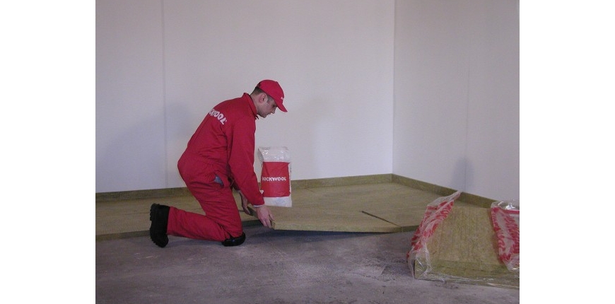 Przed przystąpieniem do ułożenia właściwej izolacji podłogi, na podkładzie betonowym, należy wykonać dylatacje obwodowe. W tym celu, stosuje się odpowiednio docięte kawałki płyty wełny. Umieszcza się je obok siebie, wzdłuż ścian i słupów. Poszczególne płyty wełny skalnej, należy układać jedna obok drugiej, na mijankę, czyli z przesunięciem krawędzi względem sąsiadujących płyt. Płyty powinny szczelnie do siebie przylegać. Przed wykonaniem wylewki, płyty wełny mineralnej należy zabezpieczyć, osłaniając je folią paraizolacyjną. Jej użycie przyspieszy proces wysychania jastrychu i zapobiegnie wnikaniu wylewki w ewentualne szczeliny, między płytami wełny. Na tak przygotowanym podłożu, można rozpocząć układanie mieszanki betonowej. Nadmiar podkładu, ściąga się długą łatą, przesuwając ją po ustawionych uprzednio prowadnicach. Po związaniu mieszanki, można przystąpić do układania materiału posadzkowego.