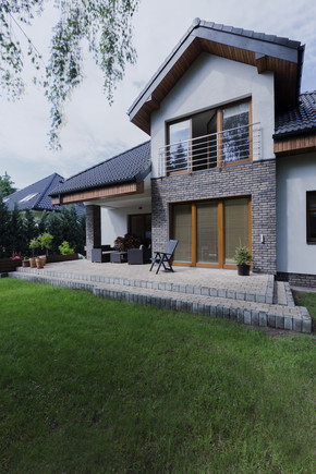 Elewacja z klinkieru może być wykonana zarówno z cegieł, jak i płytek. Należą one do najtrwalszych materiałów elewacyjnych. Jednak elewacja z klinkieru w postaci cegieł wymaga zaplanowania już na etapie projektu domu. Cegła klinkierowa jest stosowana bowiem jako wierzchnia warstwa ściany trójwarstwowej, natomiast płytki klinkierowe (najczęściej grubości od 9 do 15 mm) są znacznie bardziej uniwersalne, można je układać zarówno na ścianach trój-, jak i jedno- i dwuwarstwowych. Zaletą klinkieru są nie tylko walory estetyczne, ale też wyjątkowa odporność na uszkodzenia mechaniczne, warunki atmosferyczne i zabrudzenia. Dlatego tak chętnie klinkier wykorzystuje się przy drzwiach wejściowych, do wykończenia cokołów, narożników domu, a także podokienników. Chociaż nie należy on do najtańszych materiałów elewacyjnych, daje gwarancję, że nawet po latach elewacja z klinkieru będzie dobrze wyglądała. Pamiętajmy, że wszystkie rodzaje cegieł stosowanych na elewacji mogą być pełne lub drążone i szczelinowe – są wtedy tańsze i lżejsze. Mniej zapłacimy także za płytki elewacyjne. Przykleja się je do ściany mrozoodporną zaprawą.