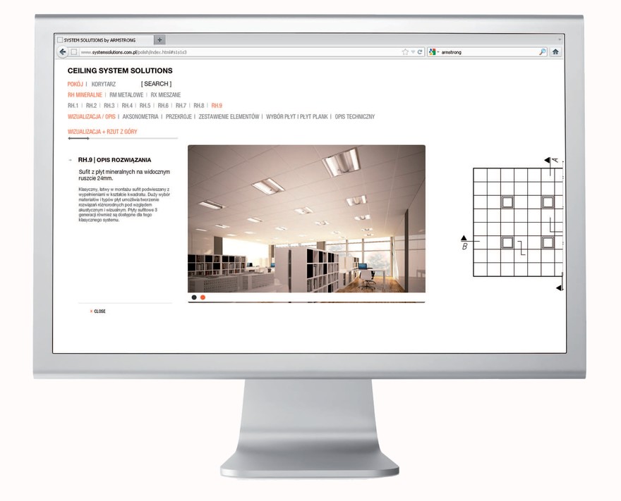 Dobór i montaż sufitów podwieszanych to proces wieloetapowy. By ułatwić pracę wykonawcom i architektom firma Armstrong opracowała specjalne narzędzie dostępne z poziomu strony www – System Solutions. W jednym miejscu zza biurka wybrać można używając różnych paramentów odpowiednie płyty i ruszt nośny. W bibliotece znajduje się ponad 50 gotowych, kompleksowych rozwiązań. Jest to platforma komunikacji między architektem, wykonawcą, inwestorem i dystrybutorem.