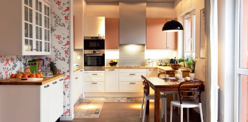 Zdj 4. Dzięki usytuowaniu pionu wodno-kanalizacyjnego w narożniku kuchni udało się uniknąć umieszczenia szafki narożnej. Aspekt wygody podyktował również wybór płyty kuchennej na 6 palników, która pomieści nawet 2 patelnie lub dużego woka.