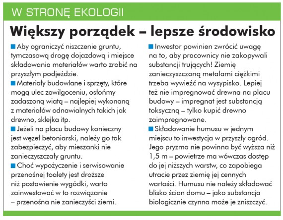 Z myślą o jutrze. Zagospodarowanie terenu i organizacja prac budowlanych są niezbędne do rozpoczęcia i sprawnego przebiegu robót. Pozwalają oszczędzić czas i nie ponosić nadmiernych nieprzewidzianych wydatków (brak przestojów czy gorączkowego jeżdżenia po coraz to nowe, drobne zakupy). Dbałość na etapie prac wstępnych przynosi jeszcze inne korzyści: porządek na placu i zwracanie uwagi na środowisko naturalne procentuje estetycznym i zdrowym otoczeniem przyszłego domu. Inwestuje się w ten sposób we własny dobrostan – zdrowie emocjonalne i fizyczne wynikające z przyjaznego mikroklimatu – oraz komfort życia w zadbanym otoczeniu i niezdegradowanym ekosystemie.