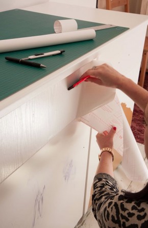 Gdy chcemy zastosować okleinę mocowaną na szafki kuchenne na ciepło, znów potrzebne będzie żelazko. Dotnijmy fragment okleiny tak, żeby wystawał poza brzegi naprawianej płaszczyzny. Ułóżmy ją i dociskajmy żelazkiem, wykonując spokojnie półkoliste ruchy, całkiem jak podczas prasowania. Pamiętajmy, żeby odpowiednio ustawić jego temperaturę. Zbyt gorące żelazko może stopić lub nadpalić okleinę. Gdy okleina wystygnie, ostrym nożem odetnijmy fragmenty wystające poza płaszczyznę. Tnijmy od klejonej powierzchni w dół, a nie odwrotnie. Krawędzie można przeszlifować delikatnie papierem ściernym o drobnym uziarnieniu (gradacja 180 lub 200).