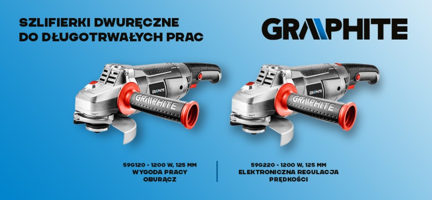 Pierwszym modelem jest szlifierka Graphite 59G120. Ten produkt ma wygodny włącznik w rękojeści wyposażony w blokadę automatycznego uruchomienia oraz daje możliwość ustawienia uchwytu bocznego w trzech kątach. Model 59G220 to podobna szlifierka kątowa 125 z regulacją obrotów. Możliwość ustawiania prędkości obrotowej pomiędzy 3000 a 10000 obrotów na minutę wpływa na precyzję wykonywanych prac i bardziej uniwersalne zastosowanie narzędzia.
