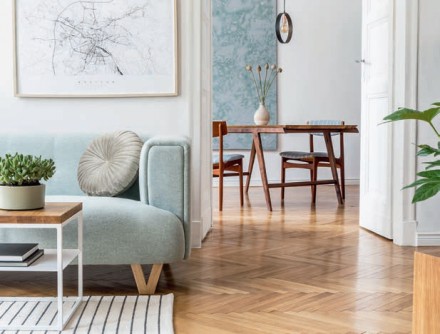 Zaletą szybkiego parkietu jest również możliwość zobaczenia już przy zakupie efektu finalnego. Posadzka często jest bowiem fabrycznie wykończona. Widzimy więc od razu, czy odpowiada nam bardziej wybrane przez nas drewno w wariancie lakierowanym czy olejowanym, błyszczące czy matowe, bielone, a może przyciemniane. Łatwiej więc będzie dopasować drewnianą okładzinę do naszych preferencji stylowych i aranżacyjnych. Finishparkiet wyróżnia też bogactwo gatunków drewna zastosowanego na licu oraz atrakcyjne wzornictwo. Na wierzchnią warstwę wykorzystuje się zarówno drewno krajowe, jak i egzotyczne. Do najczęściej wybieranych należy okładzina dębowa w różnych wariantach. Z gatunków rodzimych do efektownych należy także dwuwarstwowy parkiet jesionowy, grabowy lub orzechowy. Równie popularny jest wykonany z drewna egzotycznego – eleganckiego teku, miodowego merbau czy klimatycznego wenge. Drewno może być szczotkowane, co daje efekt postarzanej podłogi z podkreślonym usłojeniem drewna i jego strukturą. Warto wybrać parkiet fazowany czterostronnie, który dzięki załamaniu krawędzi ze wszystkich stron nadaje podłodze wyrazisty charakter. Ten rodzaj obróbki doskonale uwypukla wykończenie parkietu olejem lub olejowoskiem. Deszczułki mogą być bejcowane, co pozwala nam uzyskać pożądaną barwę drewna, jednak należy się liczyć z tym, że gdy będziemy przeprowadzać remont, to podczas cyklinowania drewno powróci do wyjściowego koloru. Parkiety dwuwarstwowe wykonuje się także z warstwą licową z thermodrewna. Dzięki czemu uzyskujemy materiał nie tylko efektowny wizualnie, ale również o doskonałych parametrach technicznych. Do wyjątkowo dekoracyjnych należy też finishparkiet z drewna wędzonego. Podczas tego procesu chemicznego drewno ciemnieje, a jego barwa zmienia się w całym przekroju elementu – podobnie jak w przypadku obróbki termicznej.