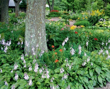 Planując rabaty czy inne nasadzenia w cieniu, warto sięgać po rośliny o zróżnicowanej wysokości. Niższe i barwniejsze warto usytuować bliżej ścieżek, natomiast wyższe oraz jednolite kolorystycznie wykorzystajmy jako ich tło. Duży wpływ na atrakcyjność aranżacji mają kształt, pokrój, faktura i kolorystyka liści oraz barwa kwiatów czy owoców – jasne i soczyste odcienie rozświetlą i ożywią tonące w mroku zakątki ogrodu. Godne uwagi są cieniolubne byliny. Te z grupy zadarniających będą pięknie wyglądać pod drzewami oraz tam, gdzie nie ma szans na bujny trawnik. Mogą to być barwinek pospolity, bluszcz pospolity, dąbrówka rozłogowa czy gajowiec żółty i konwalia majowa. Na rabaty z długiej listy cieniolubnych bylin warto wybrać funkie, paprocie, bergenię sercowatą, fiołek wonny, dziurawiec, tawułkę Arendsa oraz ciemierniki. Ich ozdobą będą też kosaciec syberyjski, szafirki czy jaskier ogrodowy oraz zawilec leśny. W budowaniu kompozycji dobrze jest wykorzystać pnącza np. bluszcz pospolity, niektóre odmiany powojników czy kokorniak wielkolistny. Zakątki wymagające rozjaśnienia ozdóbmy kwitnącymi na biało przywarką japońską lub hortensją pnącą. W cieniu świetnie sobie poradzą liczne krzewy i drzewa. Do bardzo ozdobnych należą cisy: pospolity i pośredni. Okazy żeńskie obsypują jaskrawoczerwone nasiona pięknie kontrastujące z zielenią igieł. Chętnie wykorzystywane są także mahonia pospolita, laurowiśnia wschodnia, azalia japońska, hortensje – bukietowa, dębolistna i ogrodowa – czy kalina sztywnolistna.